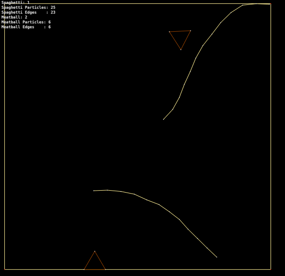 This simulation implements particle-based collision detection, impulses, and penalty forces. The goal was to add as many spaghetti pieces as possible while avoiding strand intersection.